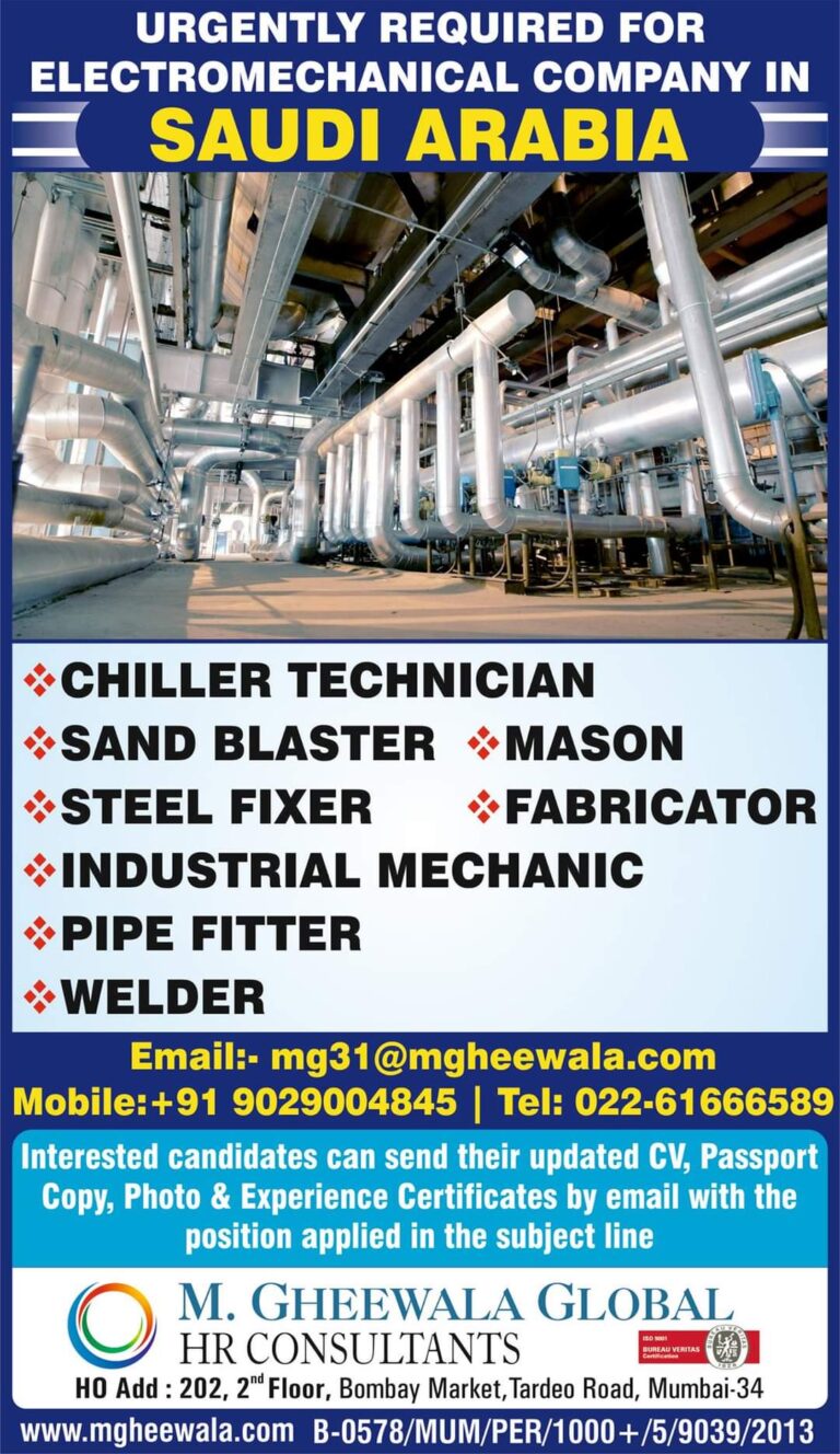 URGENTLY REQUIRED FOR ELECTRO MECHANICAL COMPANY INSAUDI ARABIACHILLER TECHNICIAN *SAND BLASTER MASON * STEEL FIXER FABRICATOR INDUSTRIAL MECHANIC*PIPE FITTER * …