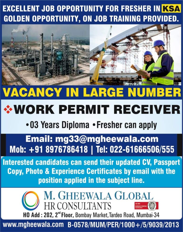 EXCELLENT JOB OPPORTUNITY FOR FRESHER IN KSAGOLDEN OPPORTUNITY, ON JOB TRAINING PROVIDED.VACANCY IN LARGE NUMBER*WORK PERMIT RECEIVER•03 Years Diploma •Fresher …