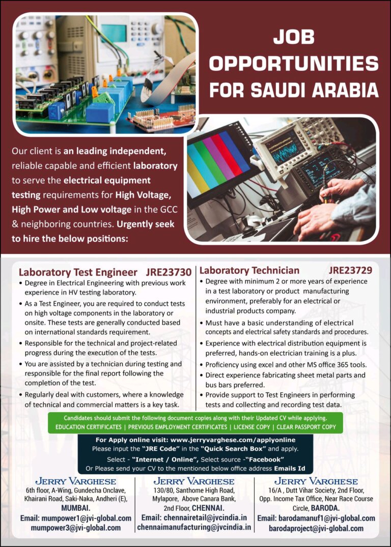 JOB OPPORTUNITIESFOR SAUDI ARABIAOur client is an leading independent,reliable capable and efficient laboratoryto serve the electrical equipmenttesting requirements for High …