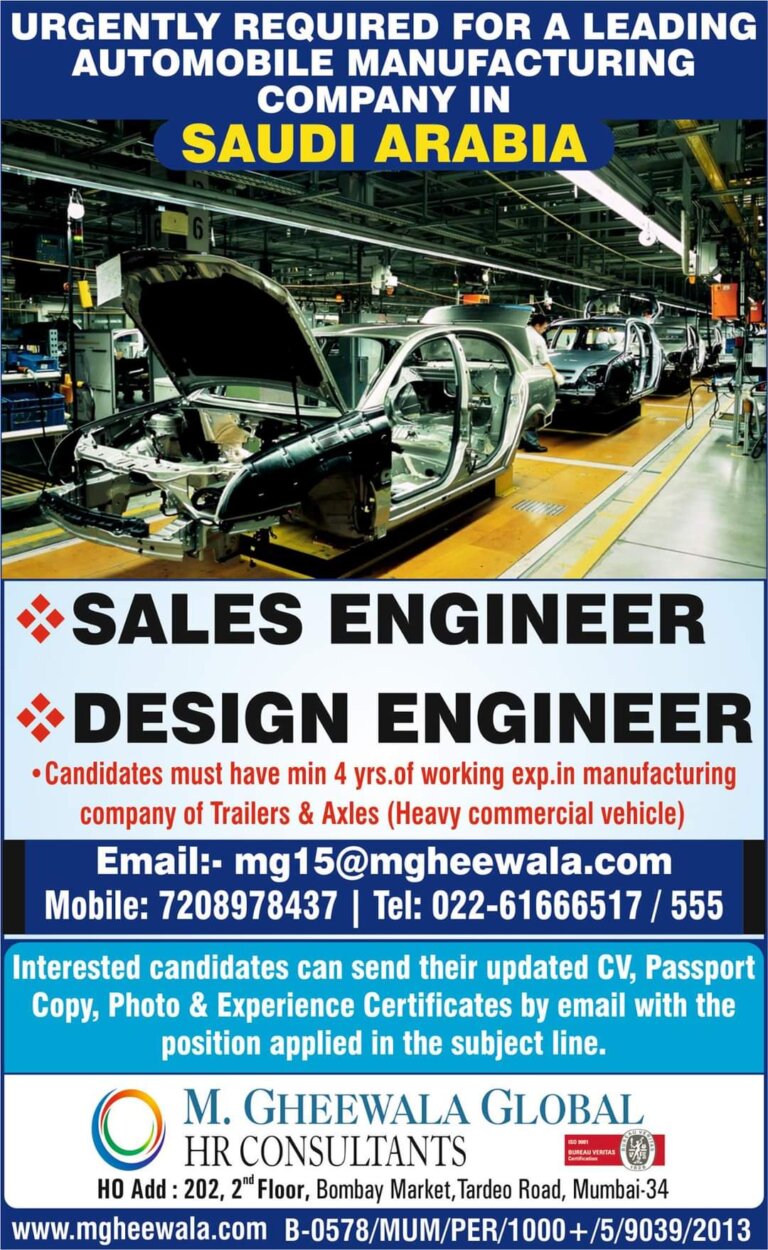 URGENTLY REQUIRED FOR A LEADING COMPANY INSAUDI ARABIAAUTOMOBILE MANUFACTURINGCOMPANY INSAUDI ARABIASALES ENGINEERDESIGN ENGINEERCandidates must have min 4 yrs.of working exp.in …