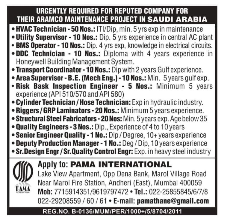 URGENTLY REQUIRED FOR REPUTED COMPANY FORTHEIR ARAMCO MAINTENANCE PROJECT IN SAUDI ARABIA• HVAC Technician – 50 Nos.: ITI/Dip, min. 5 …