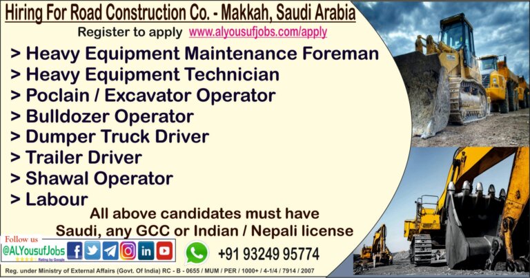 Hiring For Road Construction Co. Makkah, Saudi Arabiawww.alyousufjobs.com/applyRegister to apply Heavy Equipment Maintenance ForemanHeavy Equipment TechnicianPoclain I Excavator OperatorBulldozer OperatorDumper …