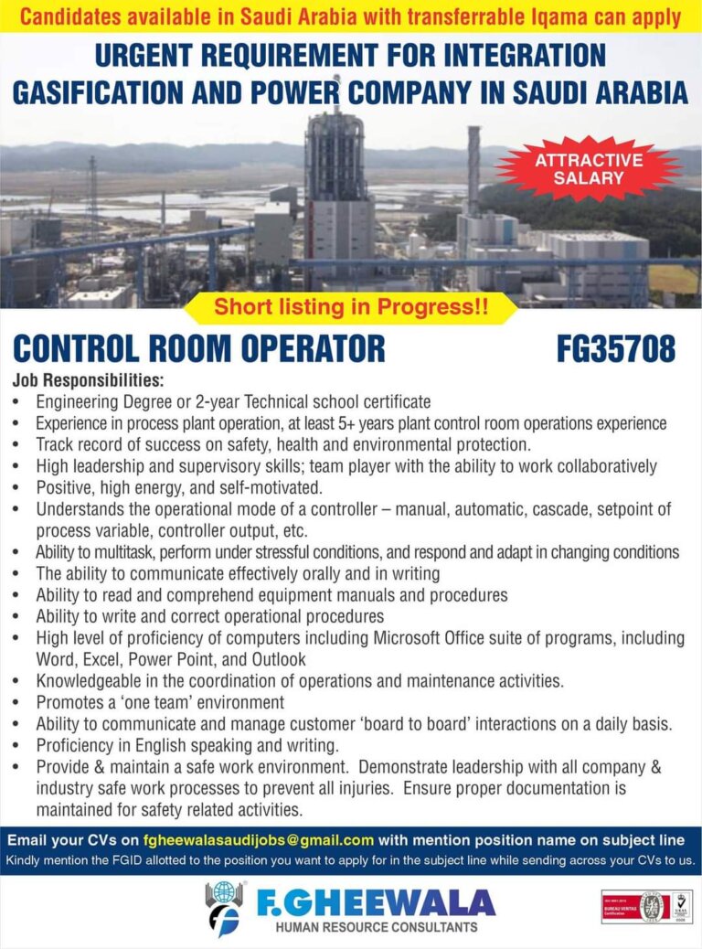 Candidates available in Saudi Arabia with transferable lqama can apply URGENT REQUIREMENT FOR INTEGRATION GASIFICATION AND POWER COMPANY IN SAUDI …