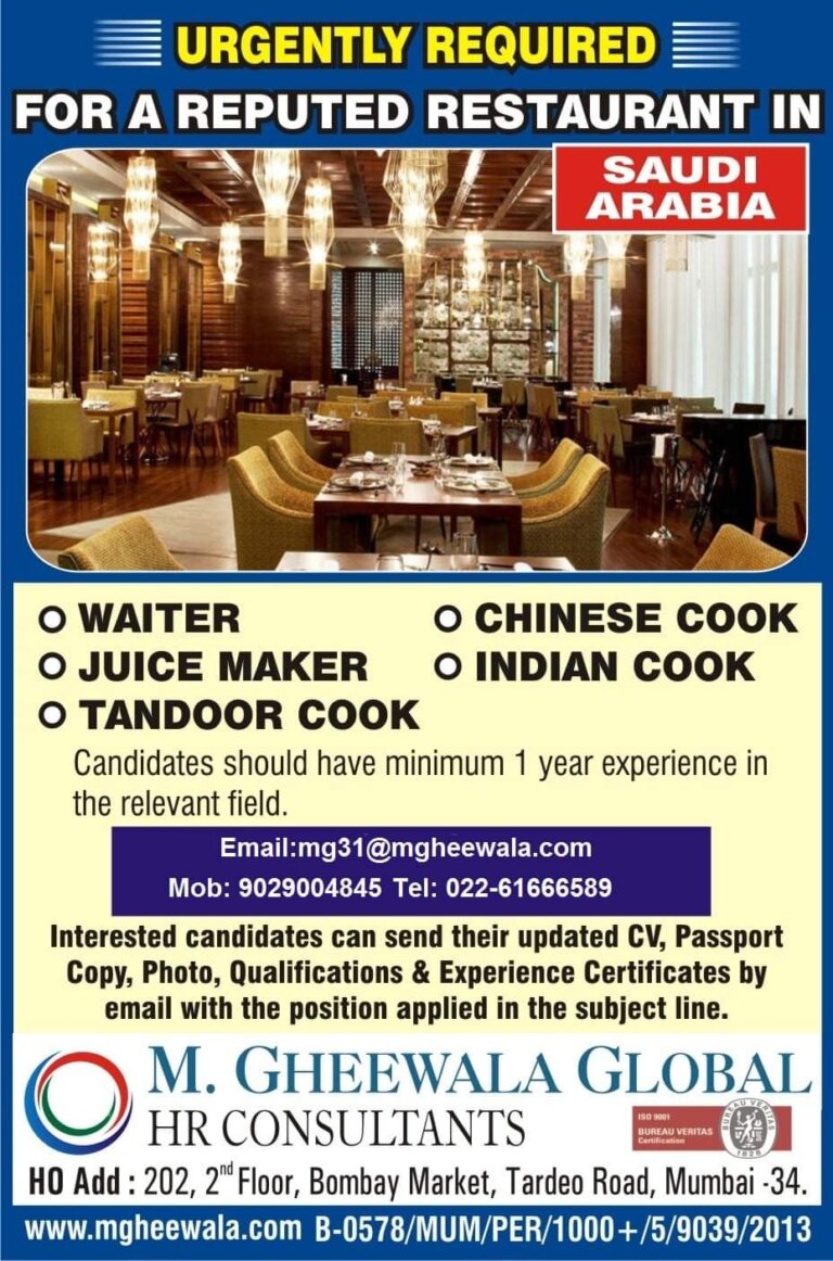 URGENTLY REQUIREDFOR A REPUTED RESTAURANT INSAUDIARABIAO WAITERO JUICE MAKERO CHINESE COOKO INDIAN COOKO TANDOOR COOKCandidates should have minimum 1 year …