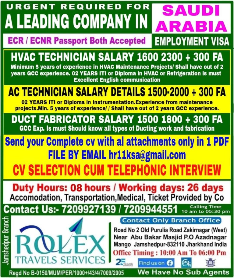 A LEADING COMPANY IN ARABIAECR I ECNR Passport Both AcceptedEMPLOYMENT VISAHVAC TECHNICIAN SALARY 1600 2300 + 300 FAMinimum 5 years …