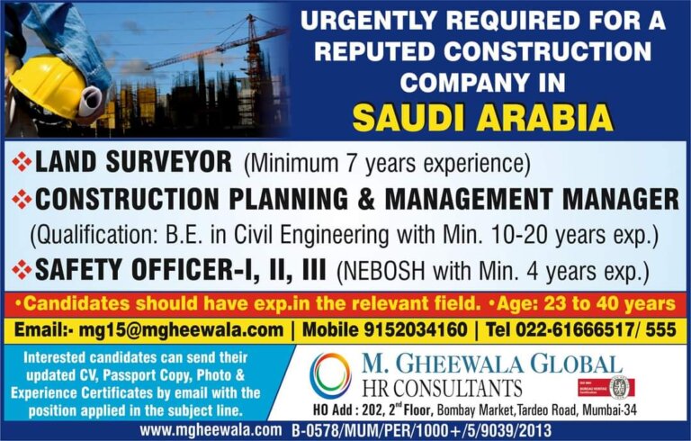 URGENTLY REQUIRED FOR AREPUTED CONSTRUCTION COMPANY IN SAUDI ARABIAOLAND SURVEYOR (Minimum 7 years experience)CONSTRUCTION PLANNING & MANAGEMENT MANAGER(Qualification: B.E. in …
