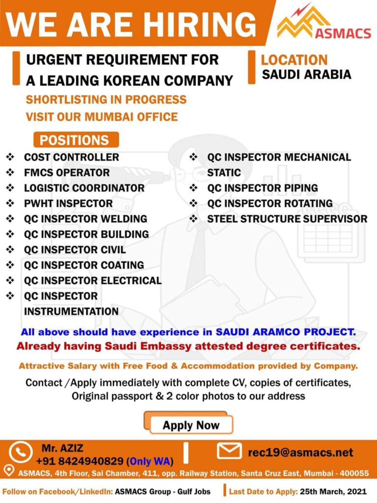 URGENT REQUIREMENT FORA LEADING KOREAN COMPANYLOCATIONSAUDI ARABIASHORTLISTING IN PROGRESSVISIT OUR MUMBAI OFFICEPOSITIONSCOST CONTROLLERFMCS OPERATORLOGISTIC COORDINATORPWHT INSPECTORQC INSPECTOR WELDINGQC INSPECTOR BUILDINGQC …