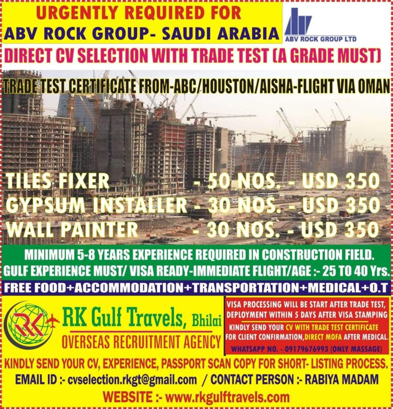 CV SELECTION WITH TRADE TEST [A GRADE MUST)TRADE TEST CERTIFICATE FROM-ABC/HOUSTON/AISHA-FLIGHT VIA OMAN:MINIMUM 5-8 YEARS EXPERIENCE REQUIRED IN CONSTRUCTION FIELD.GULF …