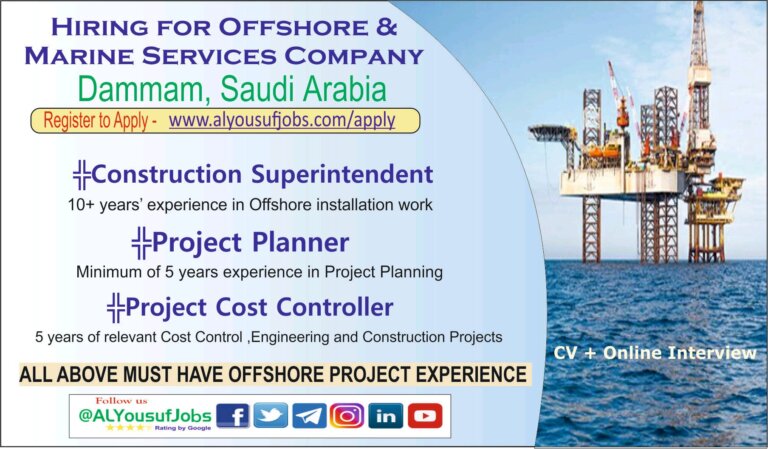 HIRING FOR OFFSHORE &MARINE SERVICES COMPANYDammam, Saudi ArabiaRegister to Apply- www.alyousufiobs.com/apply{Construction Superintendent10+ years’ experience in Offshore installation work{Project PlannerMinimum of …