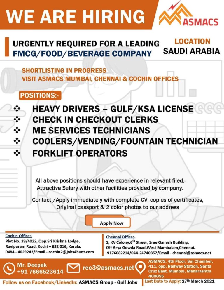 URGENTLY REQUIRED FOR A LEADINGFMCG/FOOD/BEVERAGE COMPANY SAUDI ARABIASHORTLISTING IN PROGRESSVISIT ASMACS MUMBAI, CHENNAI & COCHIN OFFICESPOSITIONS:-HEAVY DRIVERS – GULF/KSA LICENSECHECK …