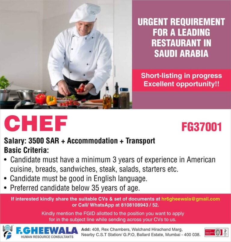 CHEFURGENT REQUIREMENTFOR A LEADINGRESTAURANT INSAUDI ARABIAShort-listing in progressExcellent opportunity!!FG37001Salary: 3500 SAR + Accommodation + TransportBasic Criteria:• Candidate must have a …