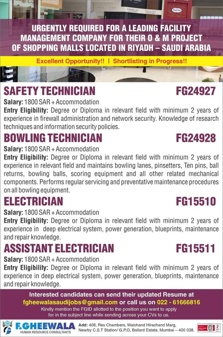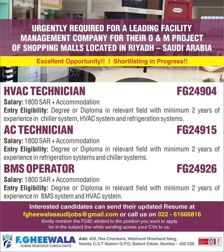 URGENTLY REQUIRED FOR A LEADING FACILITY MANAGEMENT COMPANY FOR THEIR 0 & M PROJECT OF SHOPPING MALLS LOCATED IN RIYADH …