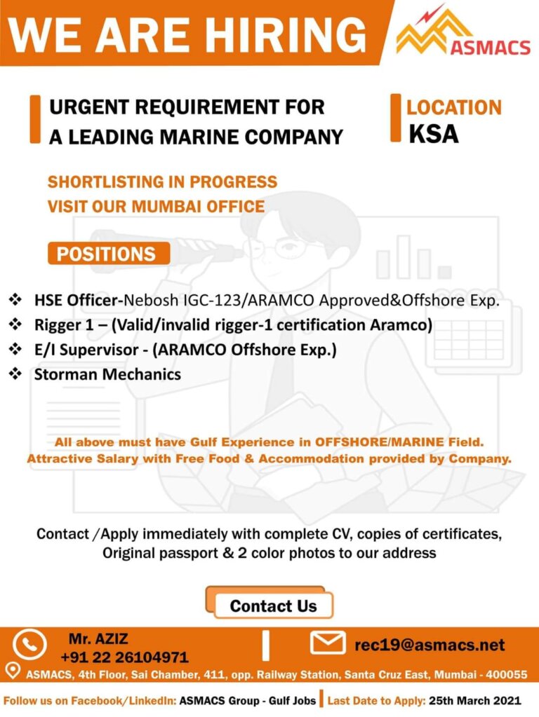 URGENT REQUIREMENT FORA LEADING MARINE COMPANYSHORTLISTING IN PROGRESSVISIT OUR MUMBAI OFFICEPOSITIONSASMACSLOCATIONKSA•e HSE Officer-Nebosh IGC-123/ARAMCO Approved&Offshore Exp.Rigger 1 — (Valid/invalid rigger-I …
