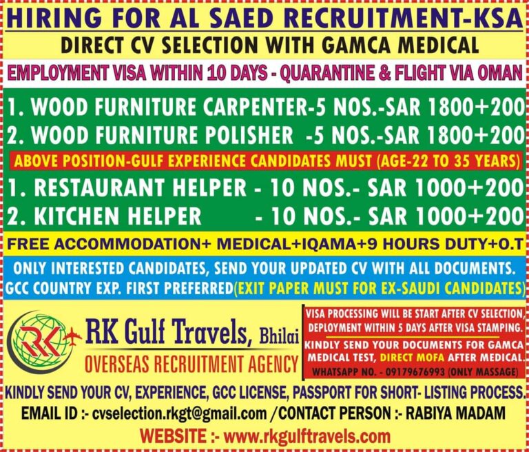 DIRECT CV SELECTION WITH GAMCA MEDICALEMPLOYMENT WITHIN 10 QUARANTINE & FLIGHT VIA OMANh. WOOD FURNITURE CARPENTER-5 NOS.-SAR 1800+200ii2. WOOD FURNITURE …