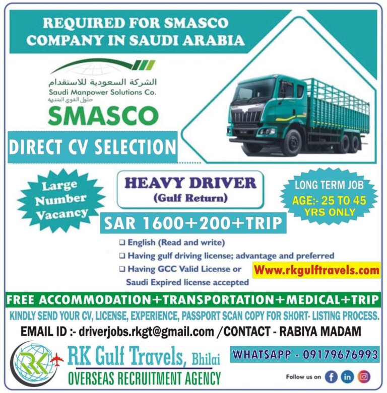 REQUIRED FOR SMASCOCOMPANY IN SAUDI ARABIASaudi Manpower Solutions co.SMASCODIRECT CV SELECTIONLargeNumberVacancyHEAVY DRIVER(Gulf Return)SAR 1600+200+TRlPEnglish (Read and write)LONG TERM JOBAGE:- 25 …