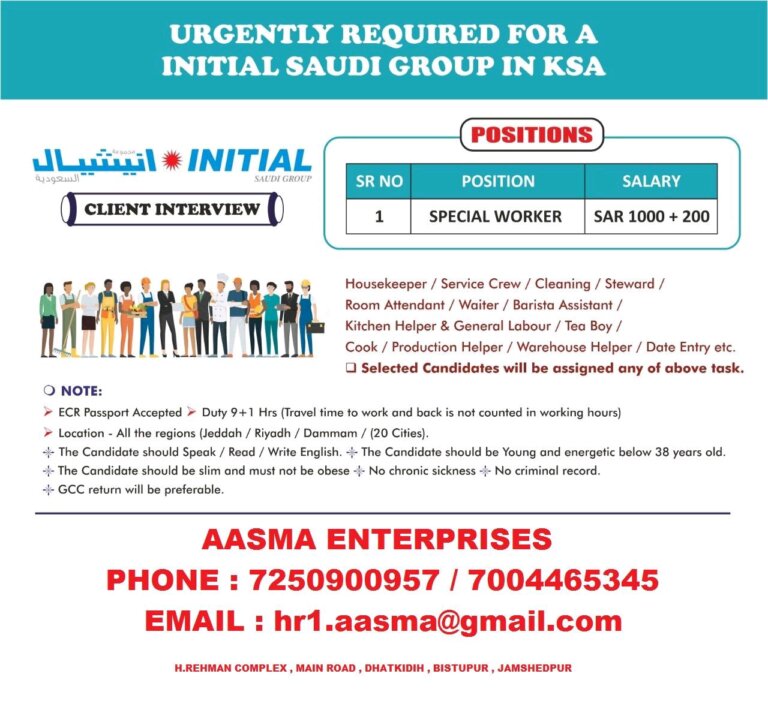 URGENTLY REQUIRED FOR AINITIAL SAUDI GROUP IN KSAPOSITIONSSAUDI GROUPCLIENT INTERVIEWSR NOPOSITIONSPECIAL WORKERSALARYSAR 1000 + 200Housekeeper / Service Crew / Cleaning …