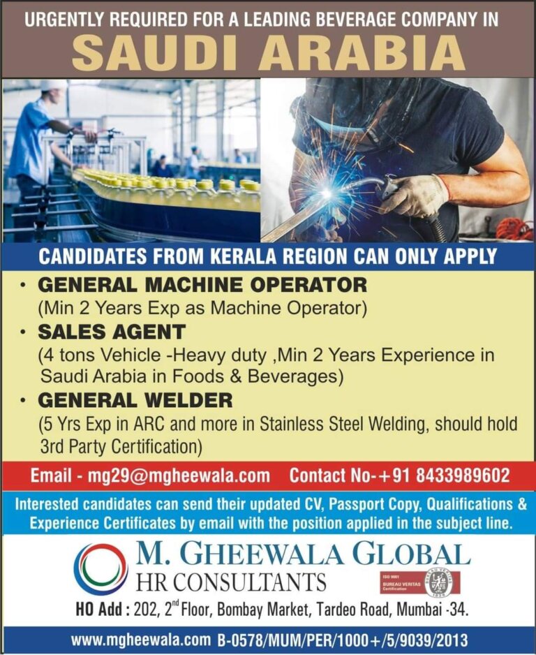 URGENTLY REQUIRED FOR A LEADING BEVERAGE COMPANY INSAUDI ARABIACANDIDATES FROM KERALA REGION CAN ONLY APPLY• GENERAL MACHINE OPERATOR(Min 2 Years …