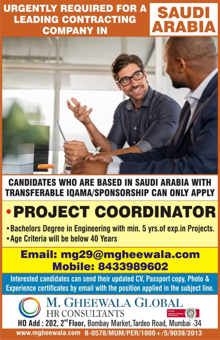 URGENTLY REQUIRED FOR ALEADING CONTRACTINGCOMPANY IN SAUDI ARABIACANDIDATES WHO ARE BASED IN SAUDI ARABIA WITHTRANSFERABLE IQAMA/SPONSORSHIP cn ONLY APPLYPROJECT COORDINATOR•Bachelors …