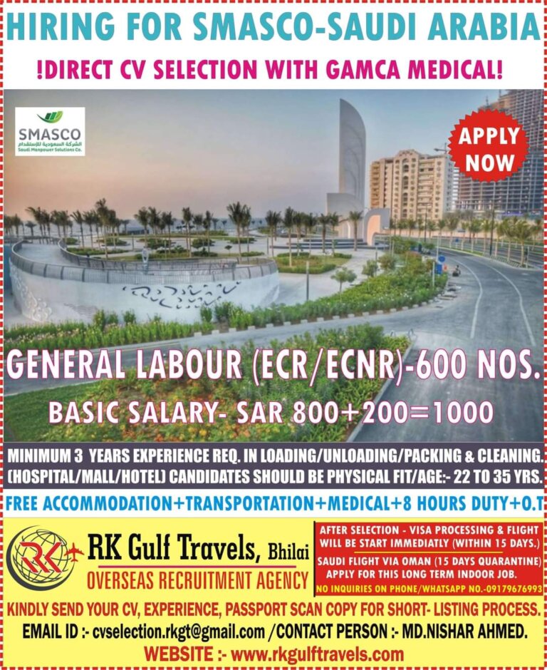 FOR SMASCO-SAUDI ARABIADIRECT CV SELECTION WITH GAMCA MEDICAL!SMASCO APPLY NOWGENERAL (ECR/ECNR)/-600 NOS.BASICSALOARY- SAR 800+200=1 OOO: MINIMUM 3 YEARS EXPERIENCE REQ. …