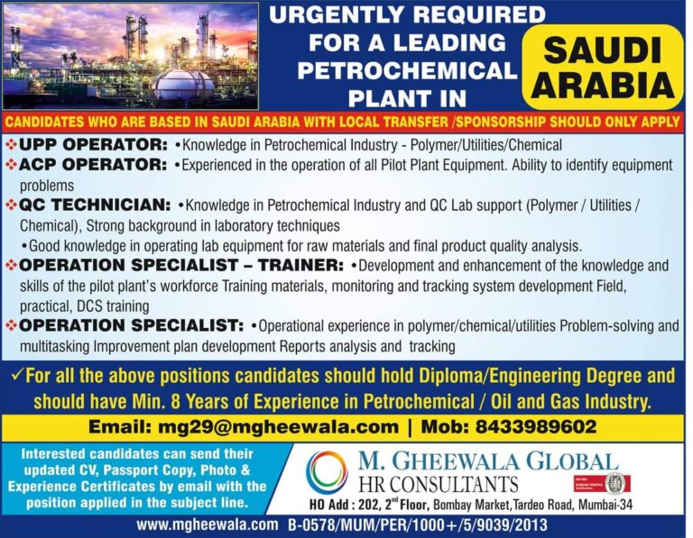 URGENTLY REQUIRED FOR A LEADING SAUDIPETROCHEMICAL ARABIA PLANT INCANDIDATES WHO ARE BASED IN SAUDI ARABIAWITHLOCAL TRANSFER ISPONSOASHIP SHOULD ONLY APPLY•UPP …