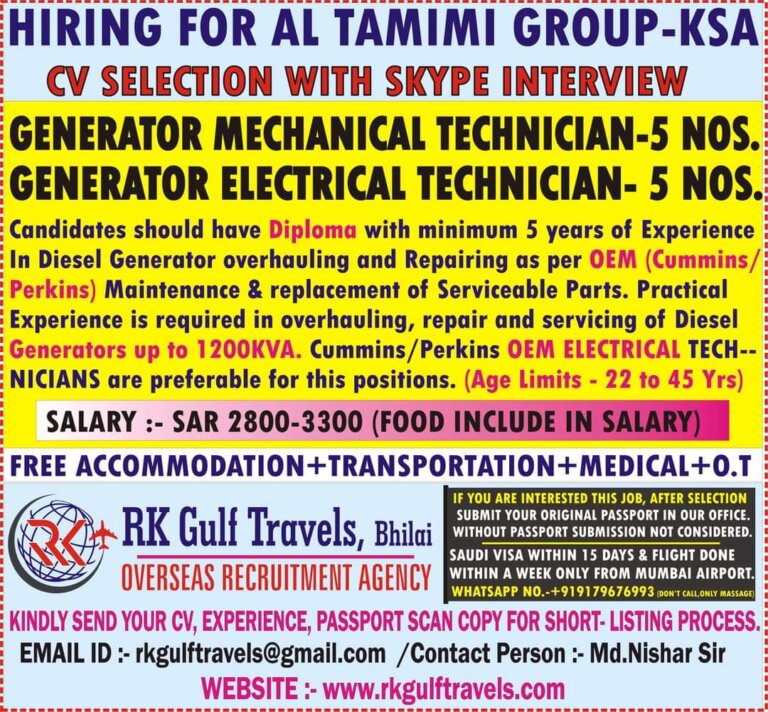 HIRING FOR AL TAMIMI GROUP-KSACV SELECTION SKYPE INTERVIEWGENERATOR MECHANICAL TECHNICIAN-5 NOS.GENERATOR ELECTRICAL TECHNICIAN- 5 NOS.Candidates should have Diploma with minimum …