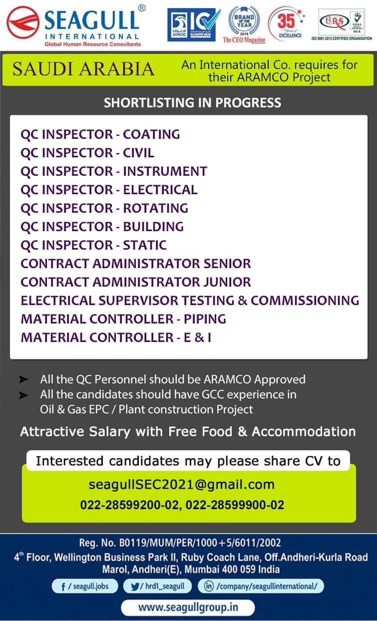 SAUDI ARABIA An International Co. requires fortheir ARAMCO ProjectSHORTLISTING IN PROGRESSqc INSPECTOR – COATINGqc INSPECTOR – CIVILqc INSPECTOR –INSTRUMENTqc INSPECTOR …