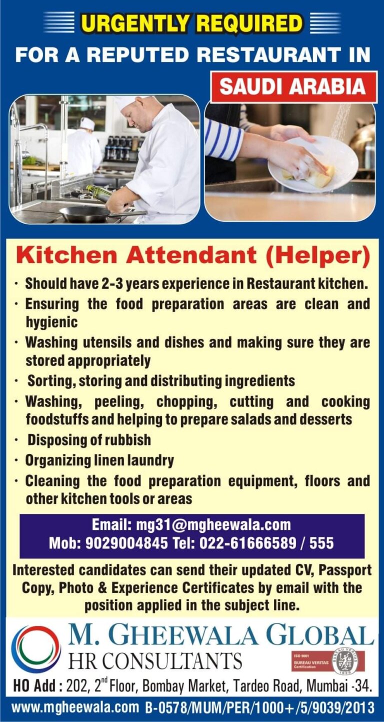 URGENTLY REQUIREDFOR A REPUTED RESTAURANT INSAUDI ARABIAKitchen Attendant (Helper)• Should have 2-3 years experience in Restaurant kitchen.Ensuring the food preparation …