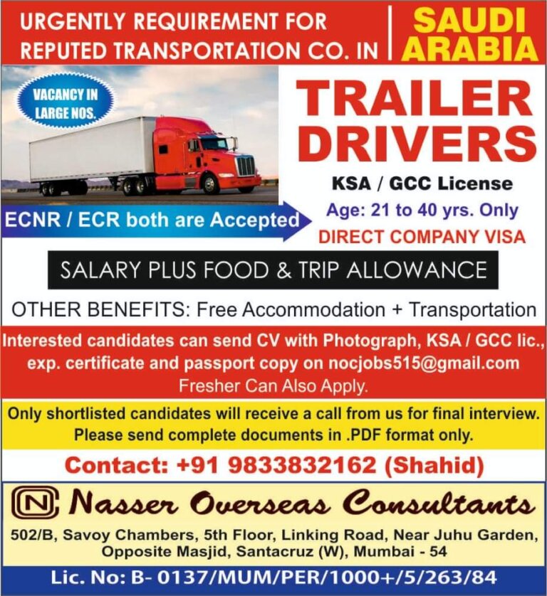 URGENT REQUIREMENT FORA LEADING COMPANYLOCATIONSAUDI ARABIAINTERVIEW IN PROGRESSVISIT OUR MUMBAI OFFICEPOSITIONS: Trailer Drivers- Valid GCC or Saudi License.Wa Iters/Asslstant Wa …