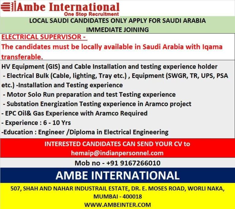 IMMEDIATE JOININGELECTRICAL SUPERVISOR –The candidates must be locally available in Saudi Arabia with Ilqamatransferable.HV Equipment (GIS) and Cable Installation and …