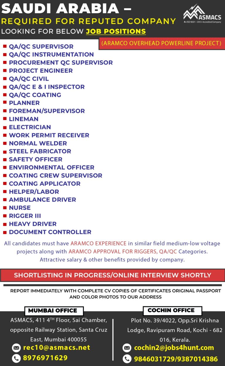 SAUDI ARABIAREQUIRED FOR REPUTED COMPANYLOOKING FOR BELOW JOB POSITIONSQA/QC SUPERVISOR■ QA/QC INSTRUMENTATION■ PROCUREMENT QC SUPERVISOR■ PROJECT ENGINEER■ QA/QC CIVIL■ QA/QC …