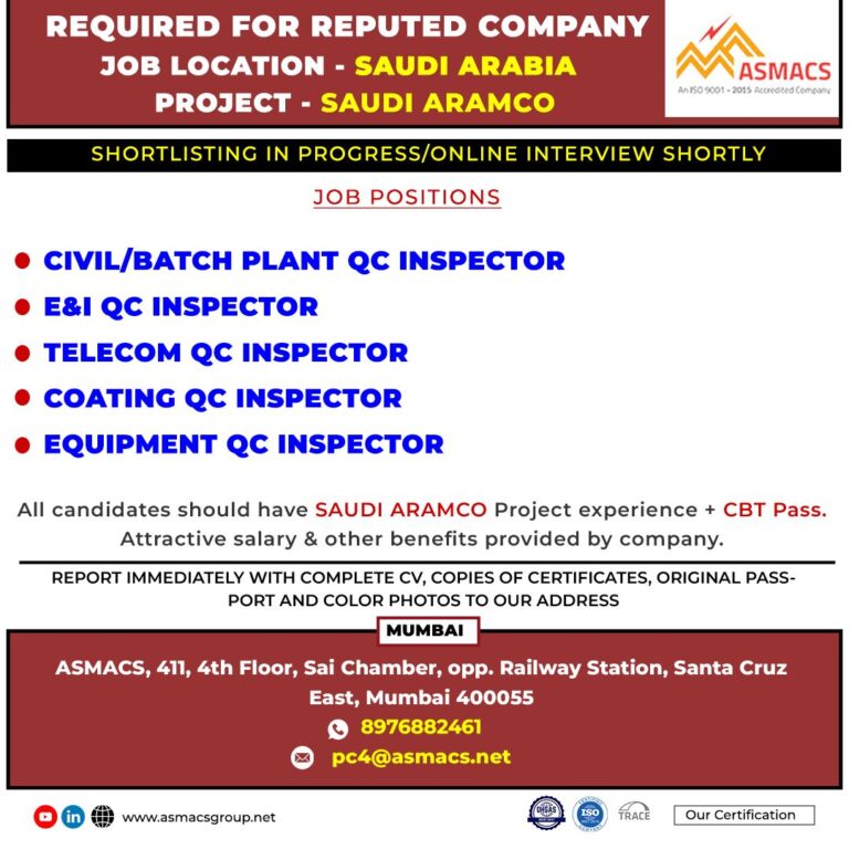 REQUIRED FOR REPUTED COMPANYJOB LOCATION – SAUDI ARABIAPROJECT – SAUDI ARAMCOSHORTLISTING IN PROGRESS/ONLINE INTERVIEW SHORTLYCIVIL/BATCH PLANT QC INSPECTOR● E&I QC …