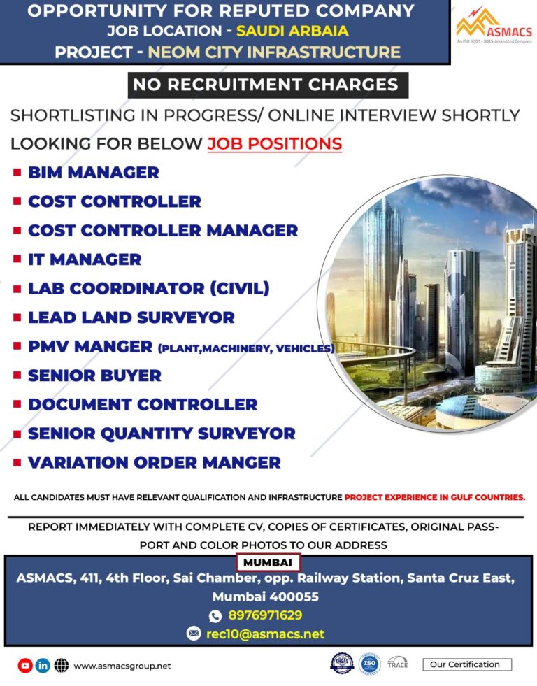 OPPORTUNITY FOR REPUTED COMPANYJOB LOCATION – SAUDI ARBAIAPROJECT – NEOM CITY INFRASTRUCTURENO RECRUITMENT CHARGESSHORTLISTING IN PROGRESS/ ONLINE INTERVIEW SHORTLYLOOKING FOR …
