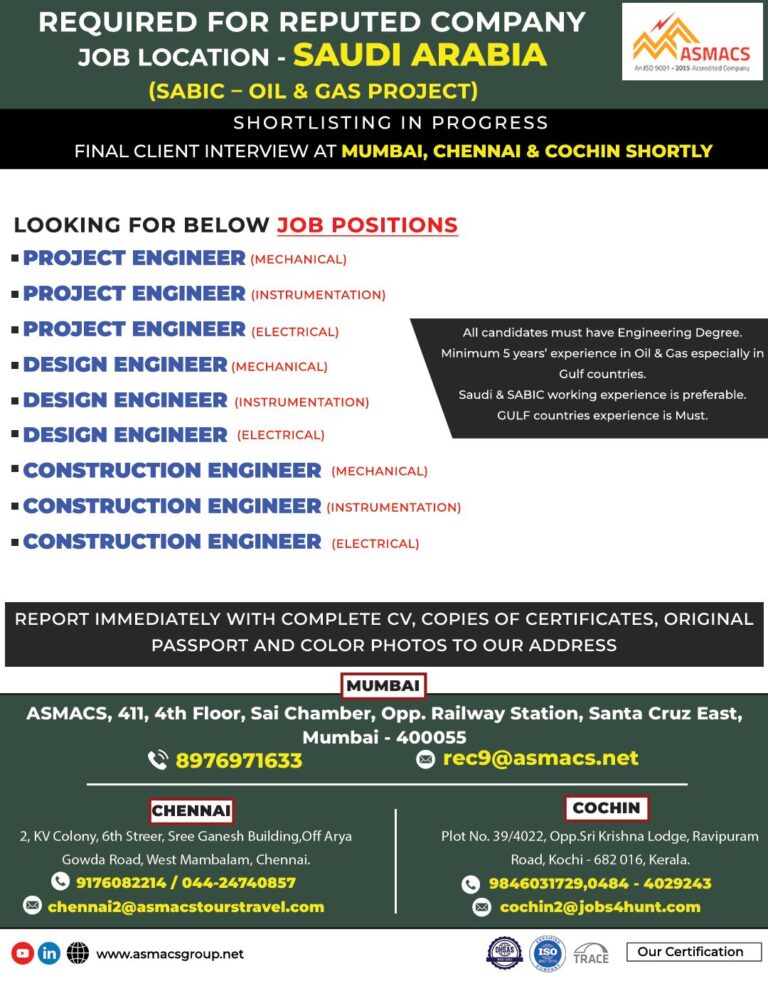 REPUTED COMPANYJOB LOCATION – SAUDI ARABIA(SABIC – OIL & GAS PROJECT)LOOKING FOR BELOW JOB POSITIONS Telegram Group Join Now