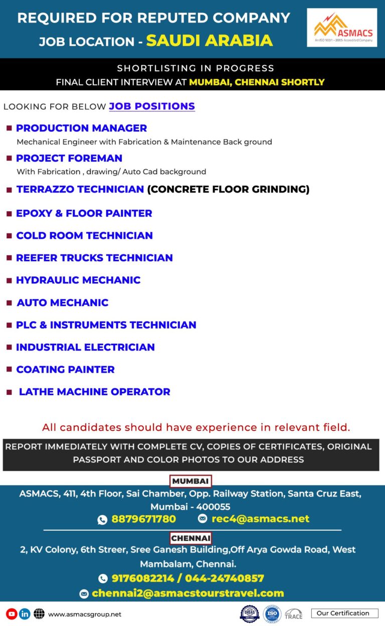 JOB OPPORTUNITIES FOR FMCG COMPANY IN CLIENT INTERVIEW WILL BEKINGDOM OF SAUDI ARABIACONDUCTED SHORTLYASSISTANT FILLINGOPERATORBUILDING MAINTENANCELEADERFILLING OPERATORMAINTENANCE TECHNICIANMIXING OPERATORMust have …