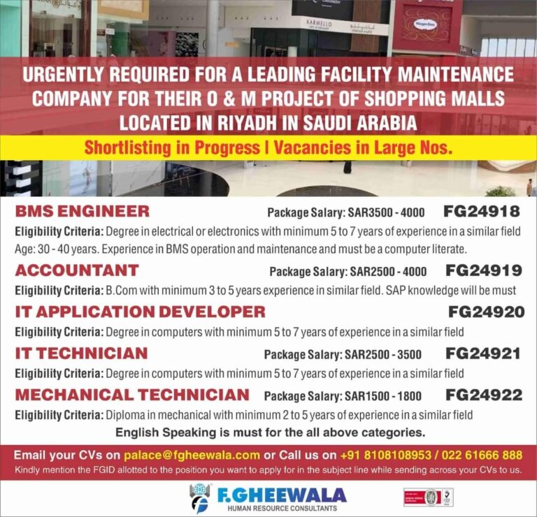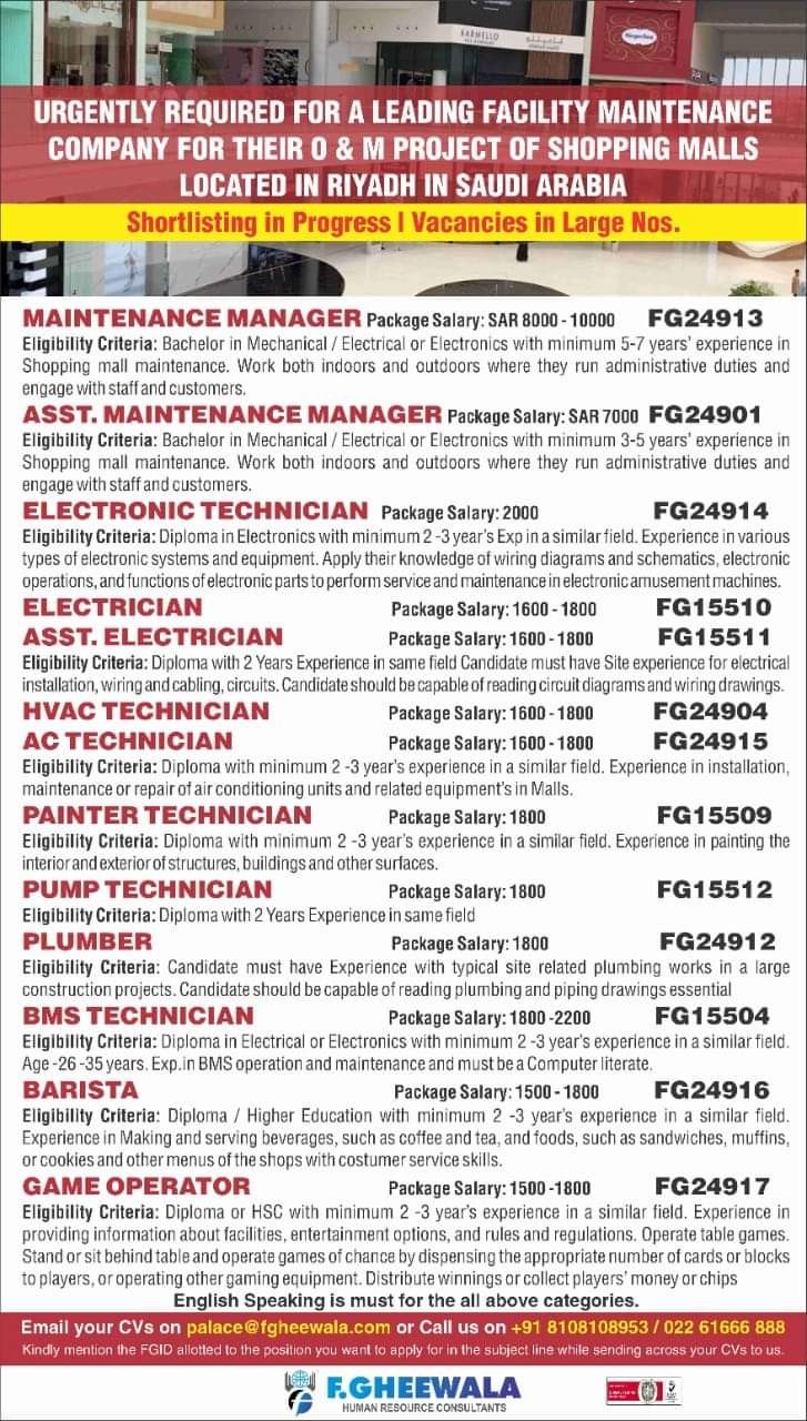 URGENTLY REQUIRED FOR A LEADING FACILITY MAINTENANCECOMPANY FOR THEIR O & M PROJECT OF SHOPPING MALLSLOCATED IN RIYADH IN SAUDI …