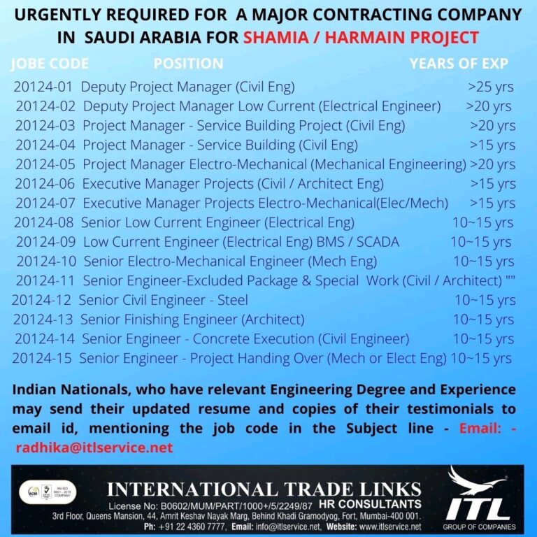 URGENTLY REQUIRED FOR A MAJOR CONTRACTING COMPANYIN SAUDI ARABIA FOR SHAMIA/ HARMAIN PROJECTPOSITIONDeputy Project Manager (Civil Eng)Deputy Project Manager Low …