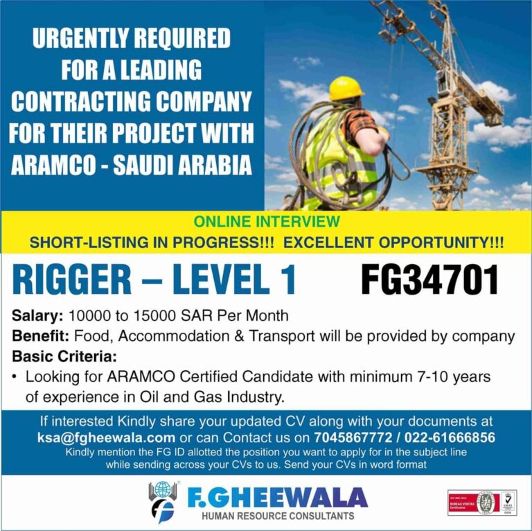 URGENTLY REQUIRED FOR ACONTRACTING COMPANYFOR THEIR PROJECT WITHARAMCO – SAUDI ARABIAONLINE INTERVIEWSHORT-LISTING IN PROGRESS!!! EXCELLENT OPPORTUNITY!!!RIGGER – LEVEL 1FG34701Salary: 10000 …