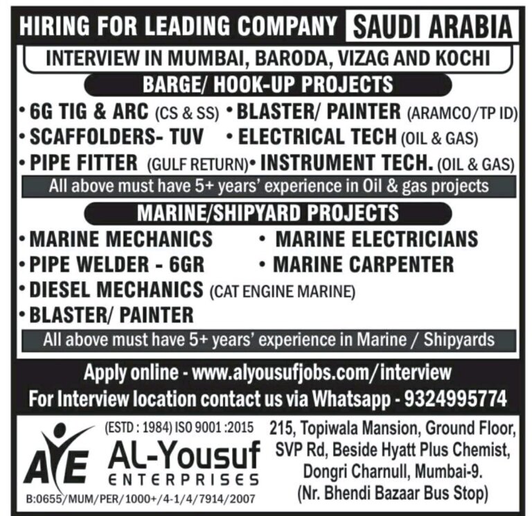 SAUDI ARABIAINTERVIEW IN MUMBAI, BARODA, VIZAG AND KOCHIBARGE/ HOOK-UP PROJECTS• 6G TIG & ARC & • BLASTER/ PAINTER ID)•SCAFFOLDERS- TUV …