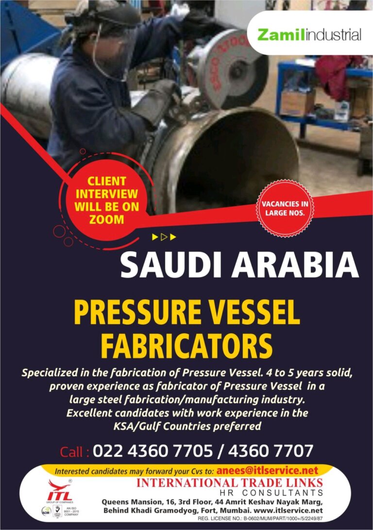 CLIENTINTERVIEWWILL BE ONZOOMZamil industrialVACANCIES INLARGE NOS.SAUDI ARABIAPRESSURE VESSELFABRICATORSSpecialized in the fabrication of Pressure Vessel. 4 to 5 years solid,proven experience …