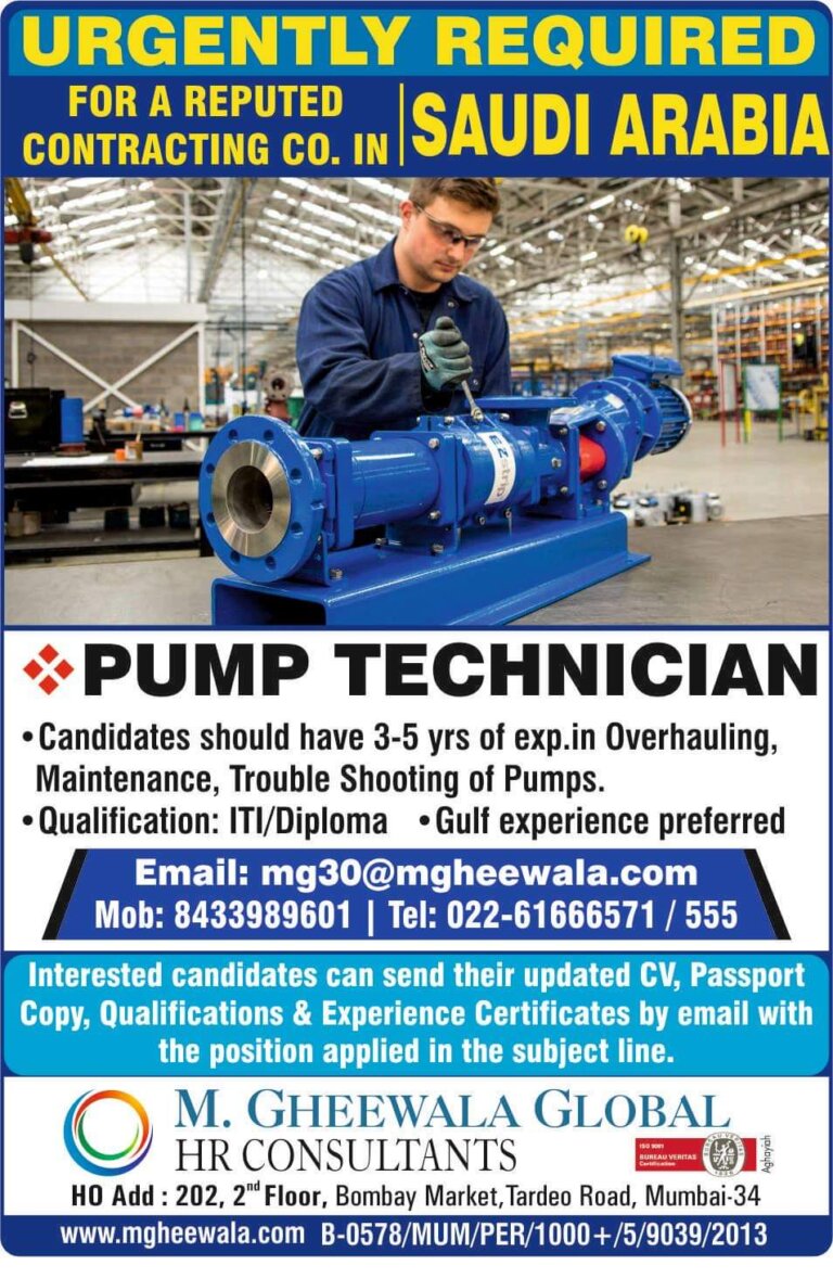 URGENTLY REQUIREDFOR A REPUTEDSAUDI ARABIACONTRACTING CO. INPUMP TECHNICIAN•Candidates should have 3-5 yrs of exp.in Overhauling,Maintenance, Trouble Shooting of Pumps.•Qualification: ITI/DipIoma …