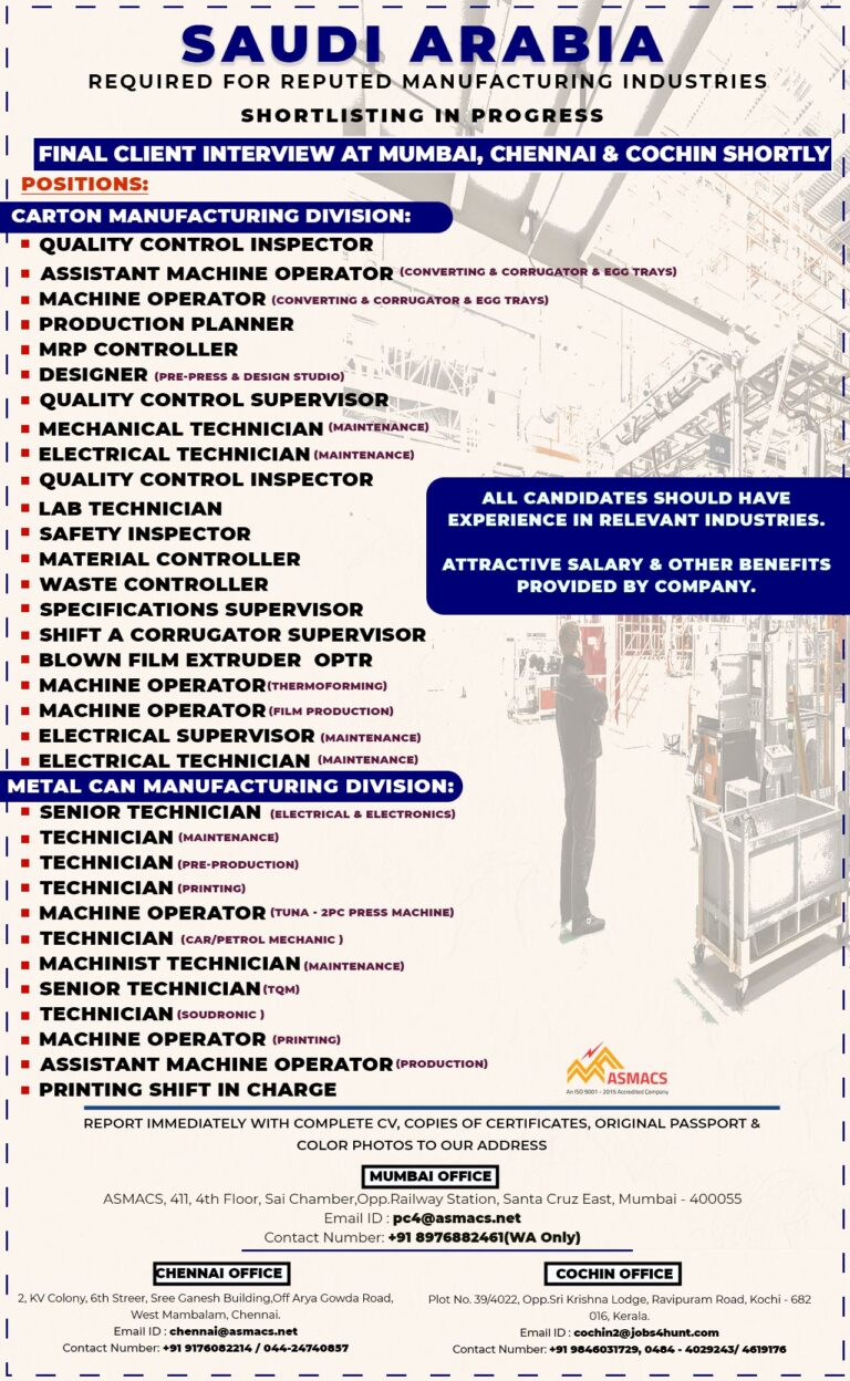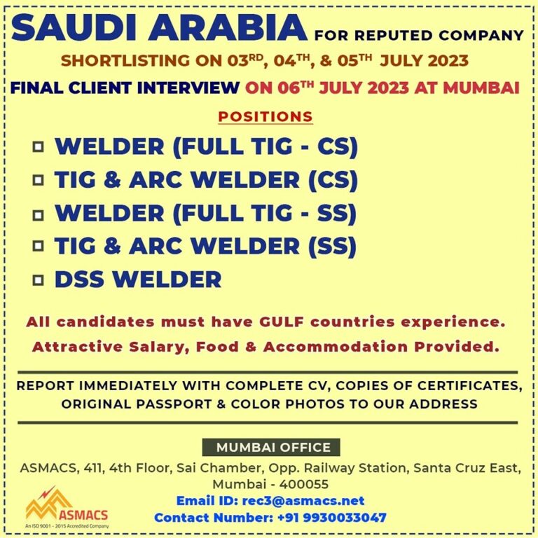 SAUDI ARABIA FOR REPUTED COMPANYSHORTLISTING ON 03RD, 04TH, & 05TH JULY 2023FINAL CLIENT INTERVIEW ON 06TH JULY 2023 AT MUMBAIPOSITIONS□ …