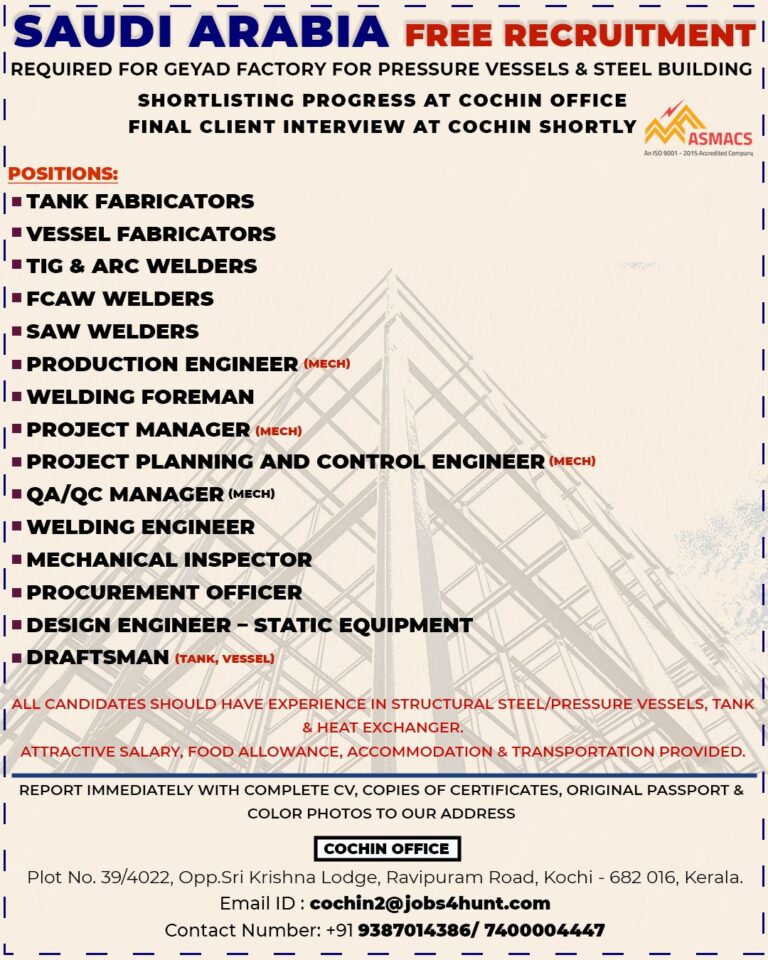 SAUDI ARABIA FREE RECRUITMENTrequired for FACTORY FOR PRESSURE VESSELS & STEEL BUILDING |SHORTLISTING PROGRESS AT COCHIN OFFICEFINAL CLIENT INTERVIEW AT …