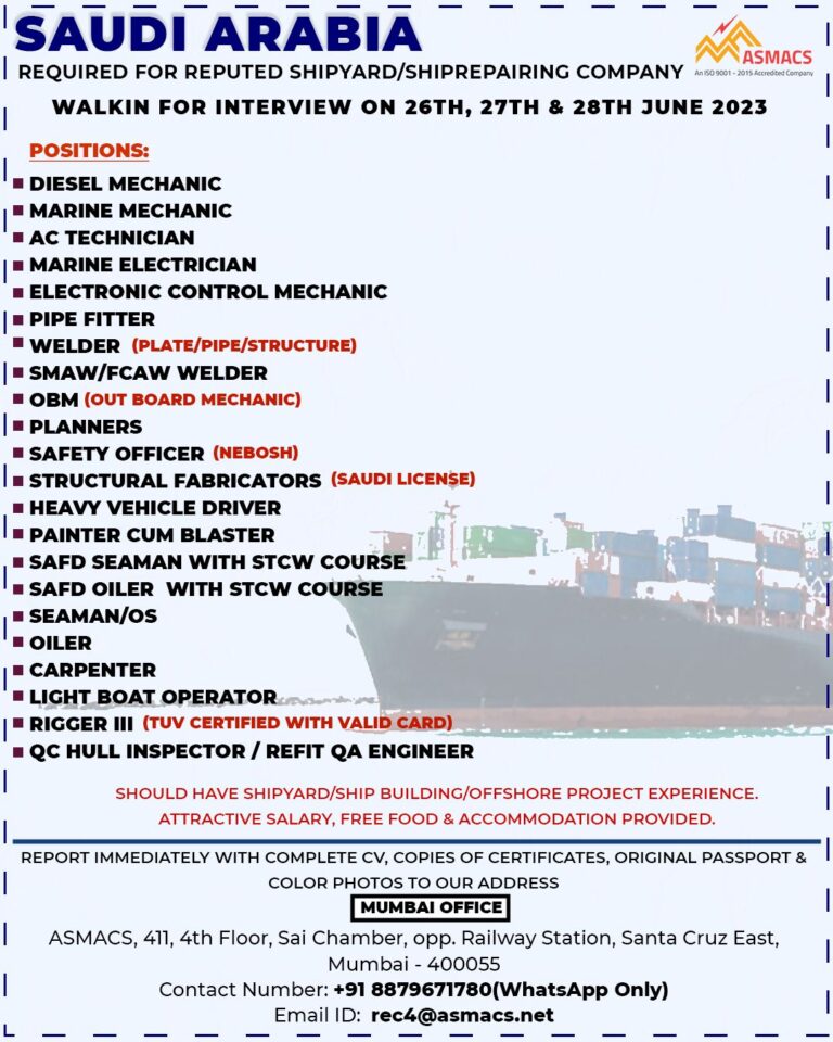 SAUDI ARABIAASMACS| REQUIRED FOR REPUTED SHIPYARD/SHIPREPAIRINGCOMPANY A150 9001-2015Accredited CompanyWALKIN FOR INTERVIEW ON 26TH, 27TH & 28TH JUNE 2023POSITIONS:■ DIESEL MECHANICMARINE …