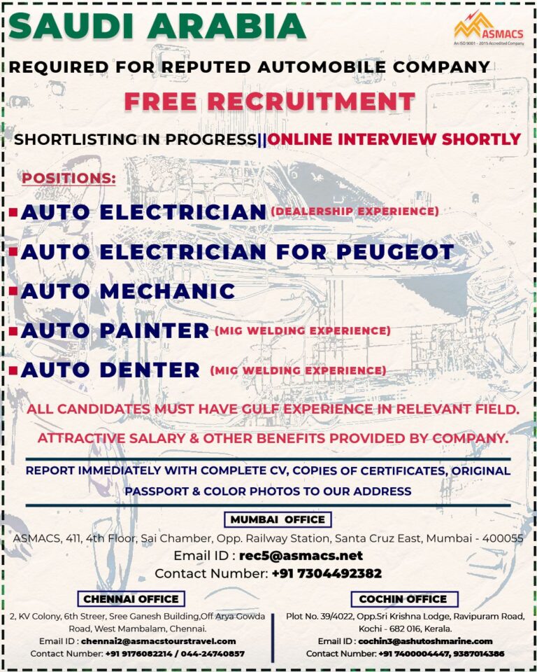 SAUDI ARABIAI REQUIRED FOR REPUTED AUTOMOBILE COMPANYFREE RECRUITMENTI SHORTLISTING IN PROGRESS||ONLINE INTERVIEW SHORTLYPOSITIONS:ASMACSAn ISO 9001-2015 Accredited Company-AUTO ELECTRICIAN (DEALERSHIP EXPERIENCE)AUTO …