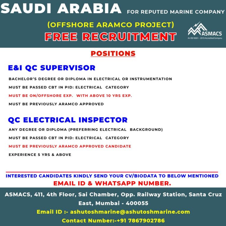 SAUDI ARABIA(OFFSHORE ARAMCO PROJECT)FREE RECRUITMENTE&I QC SUPERVISORFOR REPUTED MARINE COMPANYPOSITIONSBACHELOR’S DEGREE OR DIPLOMA IN ELECTRICAL OR INSTRUMENTATIONMUST BE PASSED CBT …