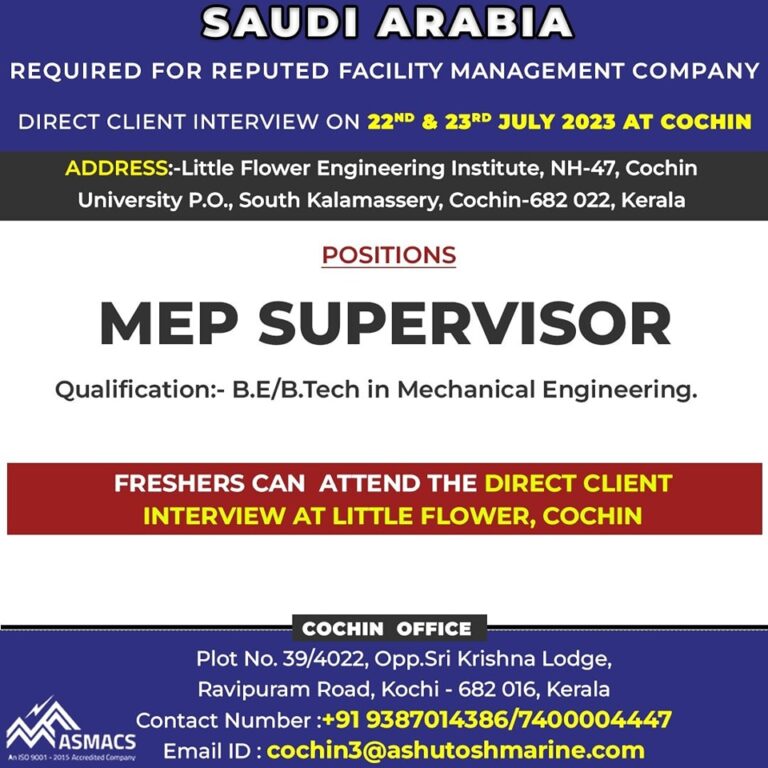 SAUDI ARABIAREQUIRED FOR REPUTED FACILITY MANAGEMENT COMPANYDIRECT CLIENT INTERVIEW ON 22ND & 23RD JULY 2023 AT COCHINADDRESS:-Little Flower Engineering Institute, …