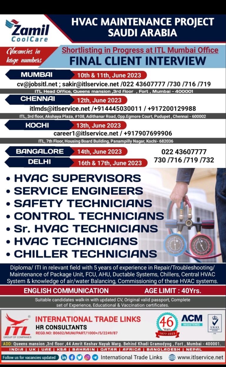 HVAC MAINTENANCE PROJECT SAUDI ARABIAShortlisting in Progress at ITL Mumbai OfficeFINAL CLIENT INTERVIEW Telegram Group Join Now