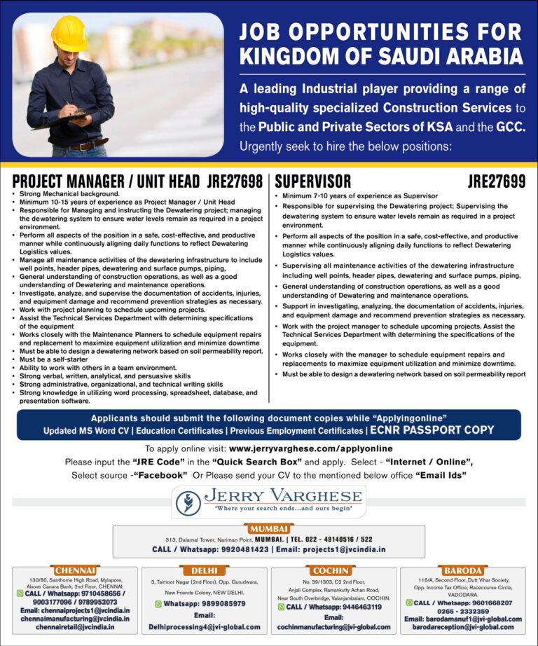 JOB OPPORTUNITIES FORKINGDOM OF SAUDI ARABIAPROJECT MANAGER / UNIT HEAD JRE27698 | SUPERVISOR Telegram Group Join Now
