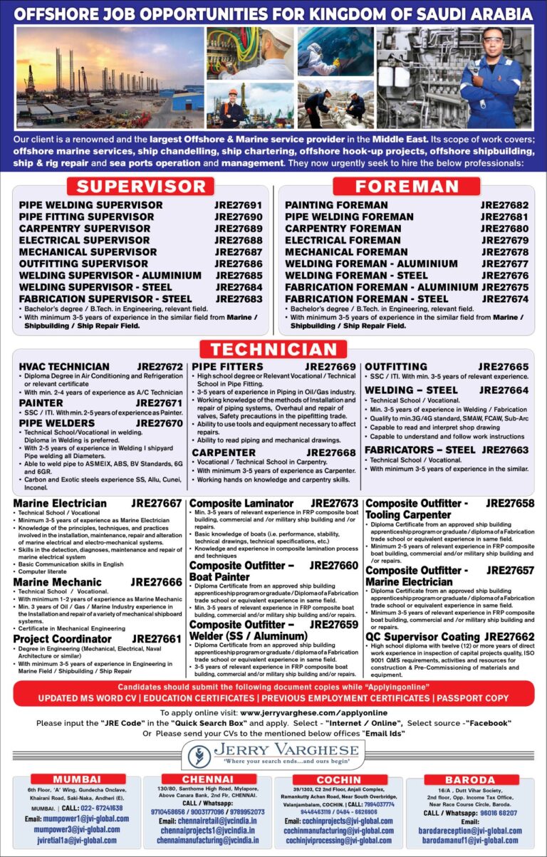 OFFSHORE JOB OPPORTUNITIES FOR KINGDOM OF SAUDI ARABIAOur client is a renowned and the largest Offshore & Marine service providerin …