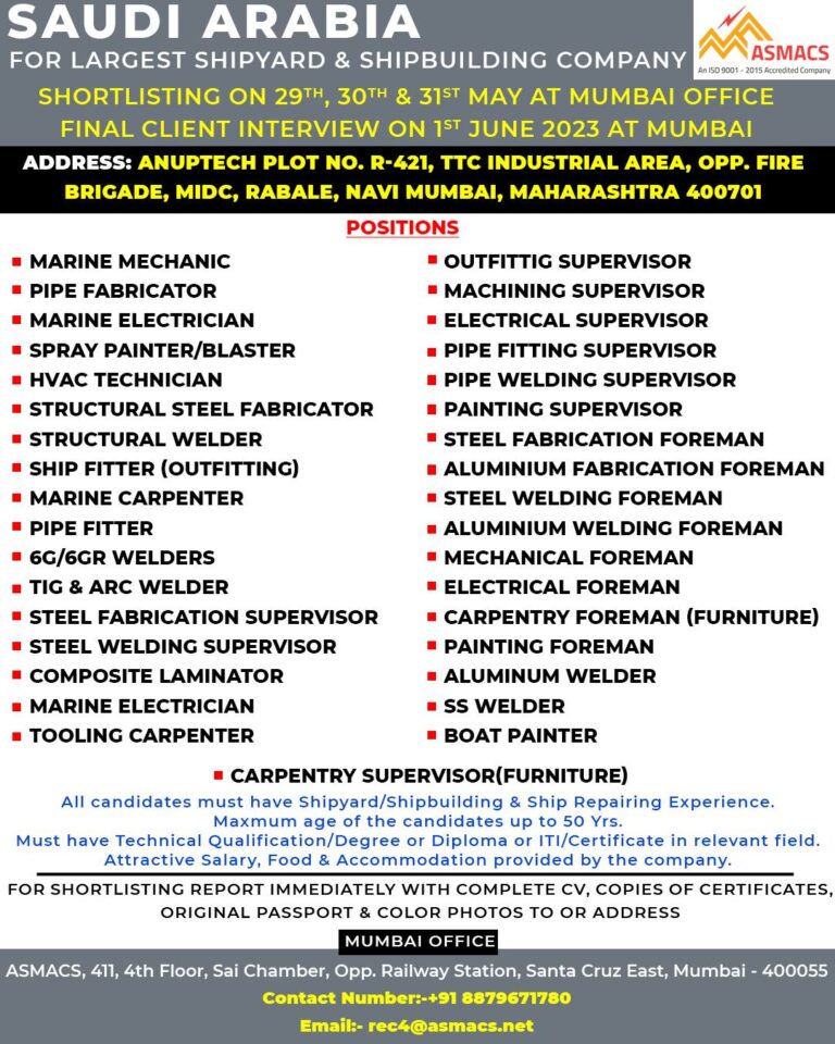 FOR LARGEST SHIPYARD & SHIPBUILDING COMPANY An ISO 9001-2015 Accredited CompanySHORTLISTING ON 29TH, 30TH & 31ST MAY AT MUMBAI OFFICEFINAL …
